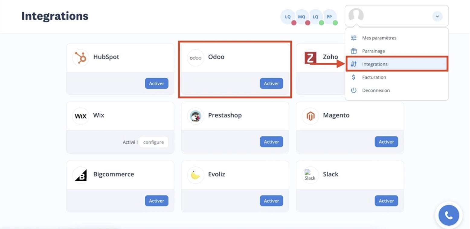 - Rendez-vous sur votre Intégration et cliquez sur “Activer” sur Odoo.