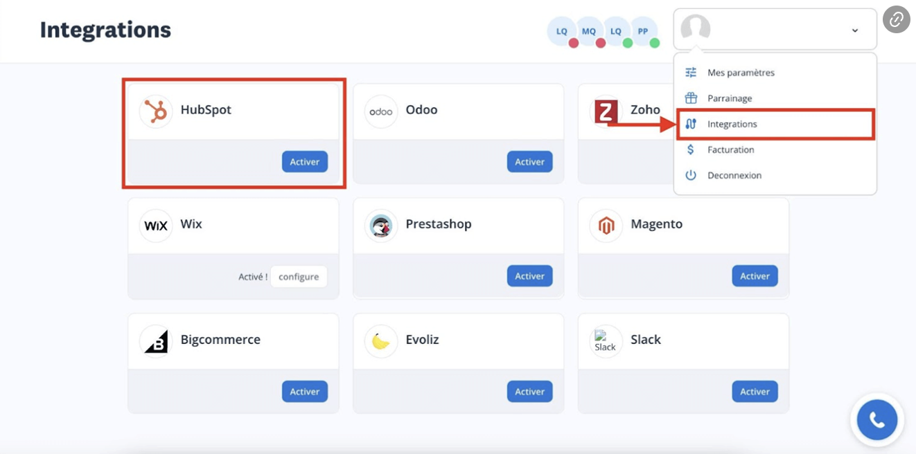 - Rendez-vous dans la section Intégration de votre compte Ringover Talk et cliquez sur Activer sur Hubspot.