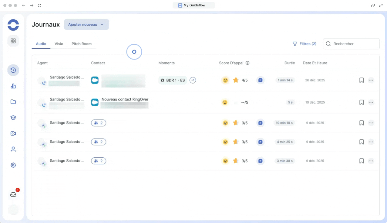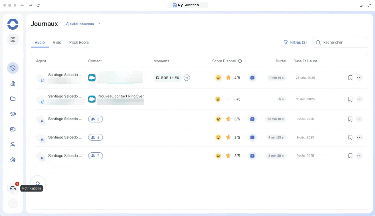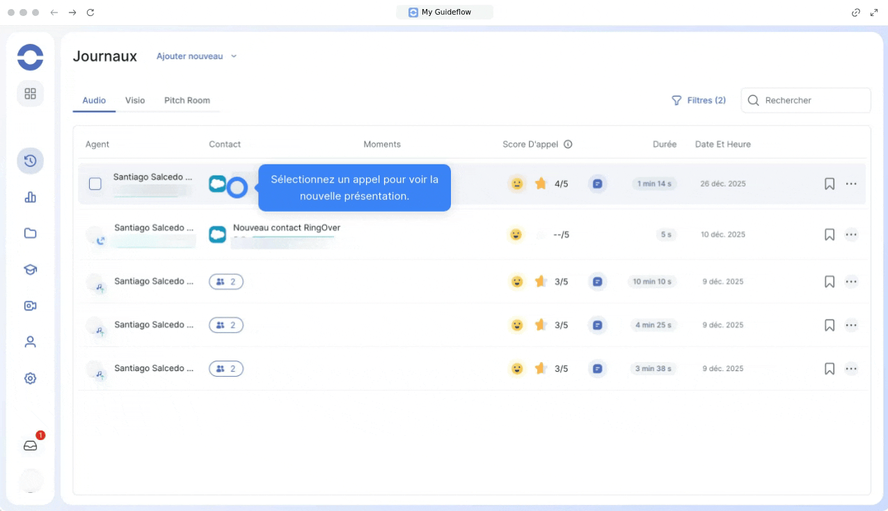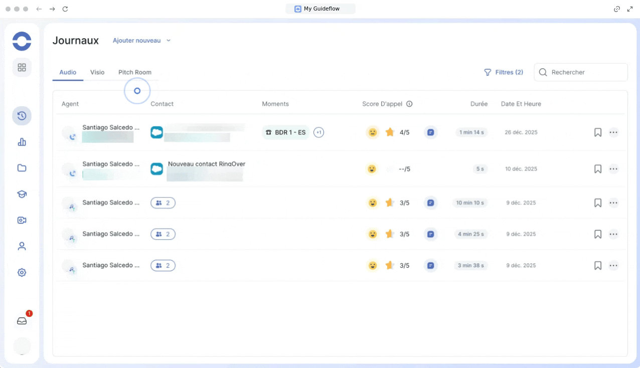 Les journaux Audio, Visio et Pitch Room sont désormais regroupés dans un emplacement central. Vous pouvez naviguer rapidement entre ces onglets sans surcharger votre écran.