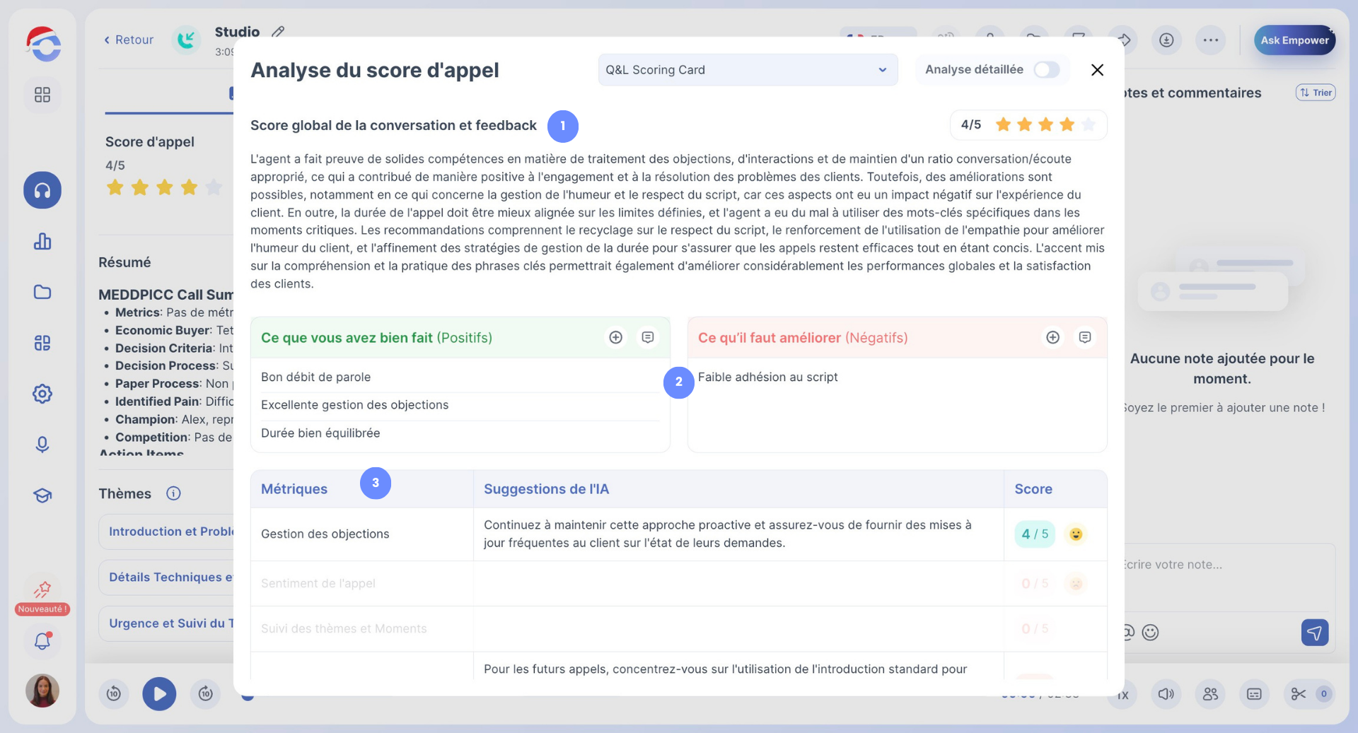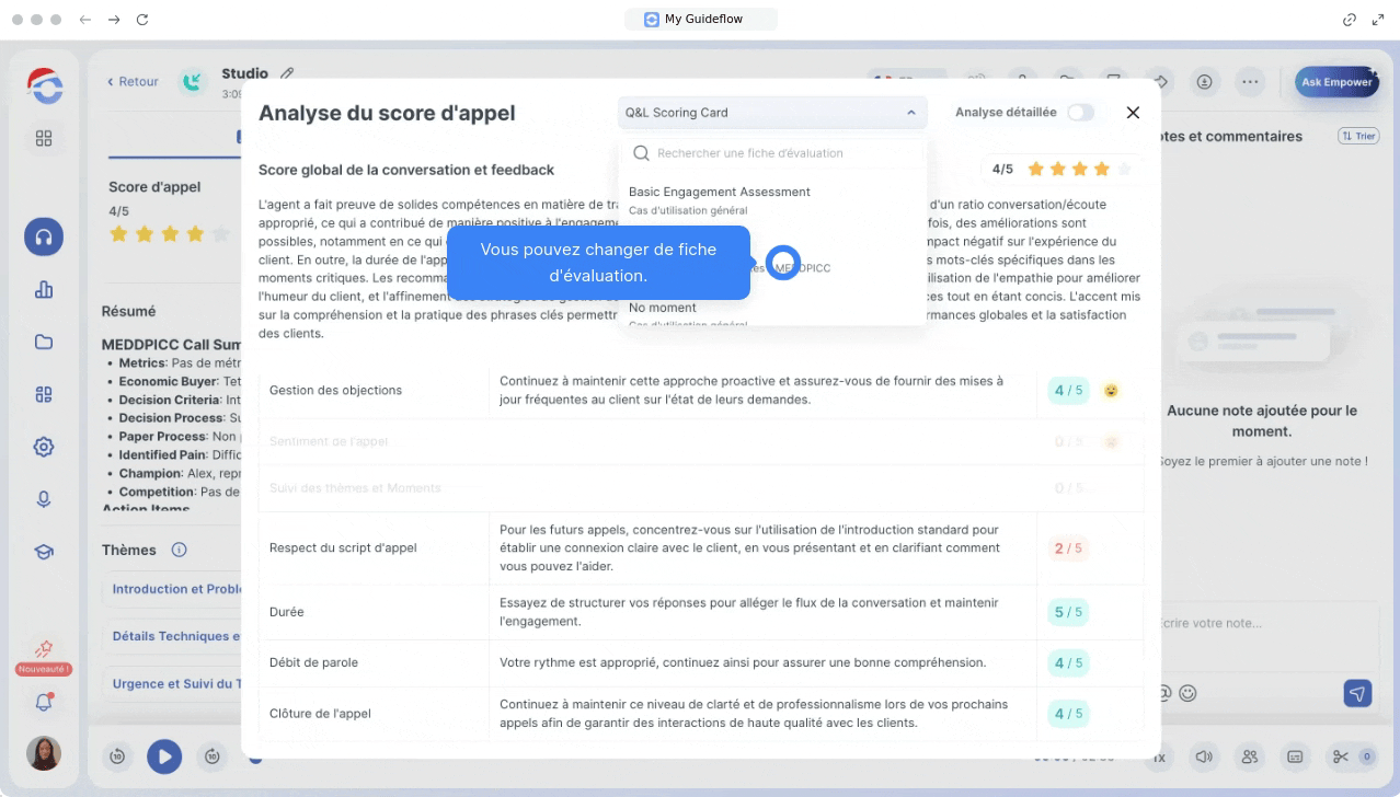 En cliquant sur le score de l’appel, vous accédez aux détails de l’évaluation, notamment :