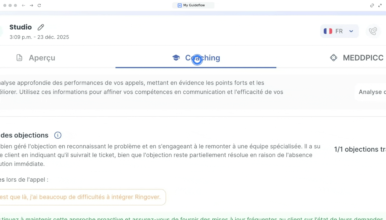 Rendez-vous ensuite dans la section « Coaching » pour consulter le détail des points observés durant l’interaction, ainsi que des conseils pour améliorer les axes identifiés.