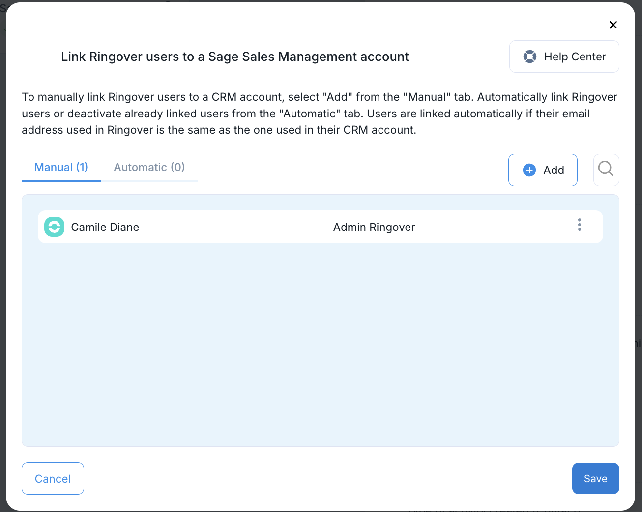 Les utilisateurs ayant la même adresse email dans Ringover et Sage sont mappés automatiquement. Si les adresses email sont différentes, vous devrez effectuer le mappage manuellement puis cliquer sur Save.