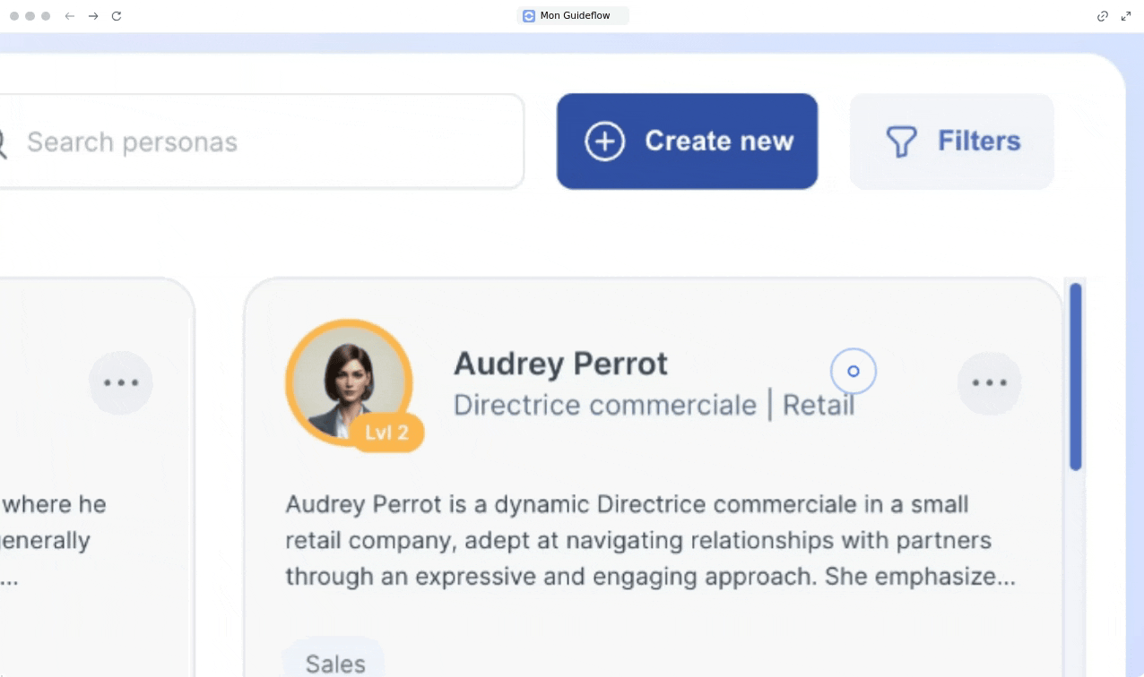 - Une fois enregistré, votre persona sera disponible dans le Pitch Room et prêt à être utilisé selon vos besoins de formation.