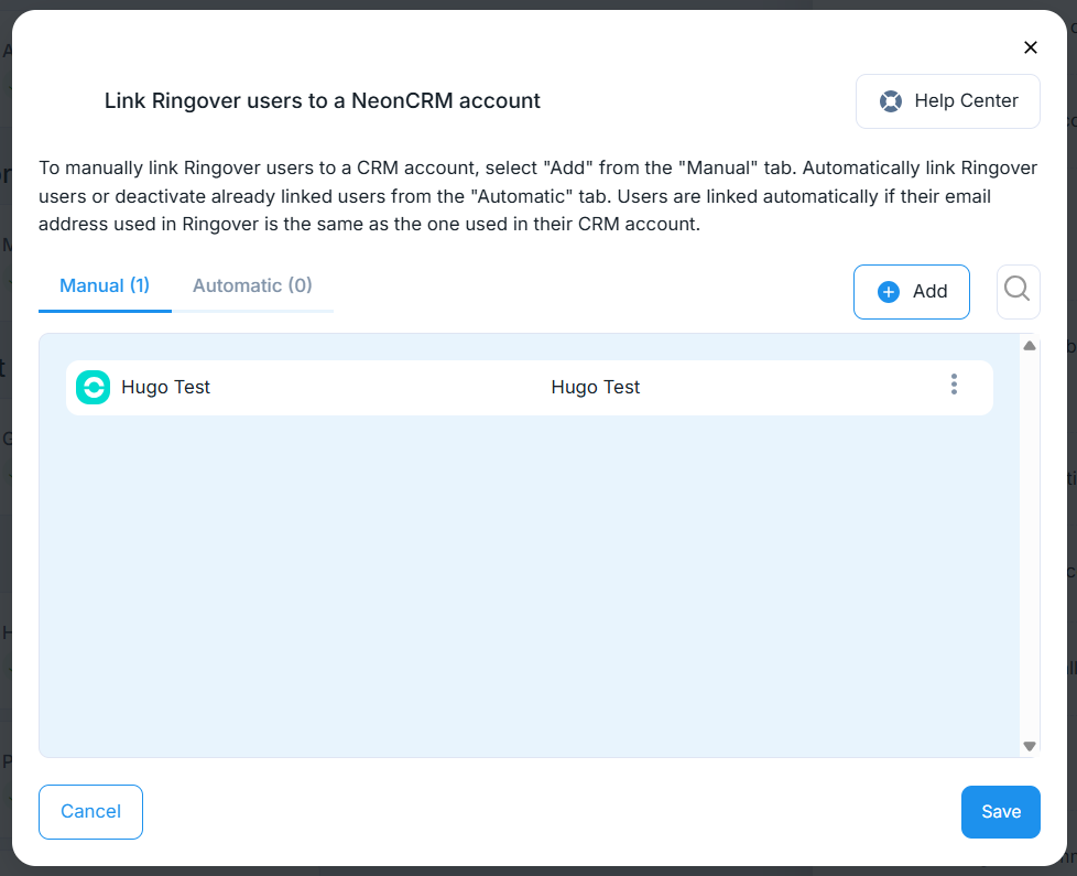 Les utilisateurs ayant la même adresse e-mail dans Ringover et Neon sont mappés automatiquement. Si les adresses diffèrent, vous devrez mapper l'utilisateur manuellement et cliquer sur Enregistrer.