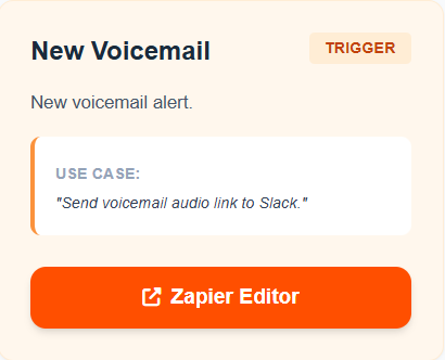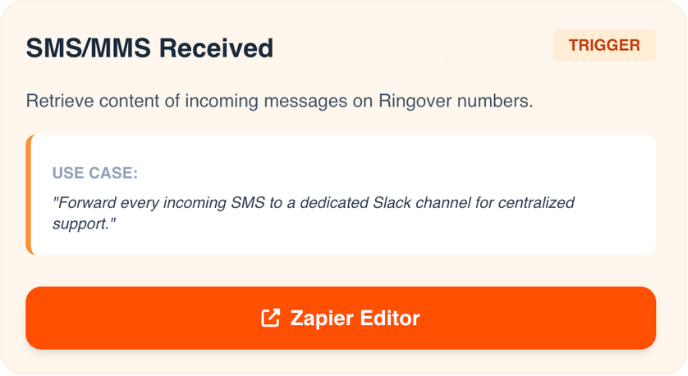 L'intégration de Ringover avec Zapier vous permet d'automatiser vos flux de travail en connectant votre système de téléphonie à plus de 8 000 applications (CRM, outils de support, applications de messagerie d'équipe). Même si votre outil n'apparaît pas directement sur le tableau de bord Ringover, vous pouvez l'ajouter via Zapier.
