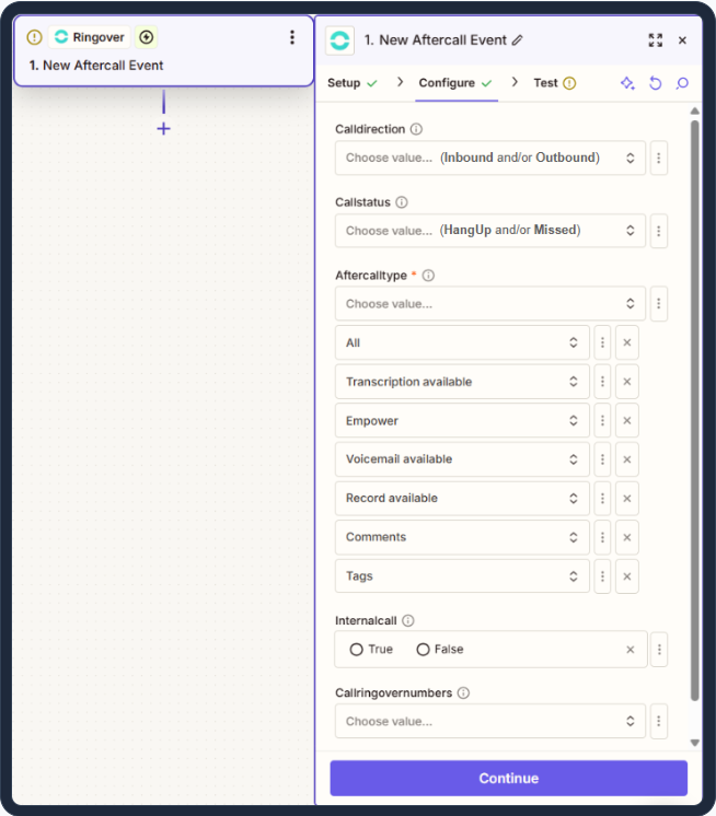 Le déclencheur est l'événement dans Ringover qui lancera l'action (p. ex., "Lorsqu'un appel se termine...").